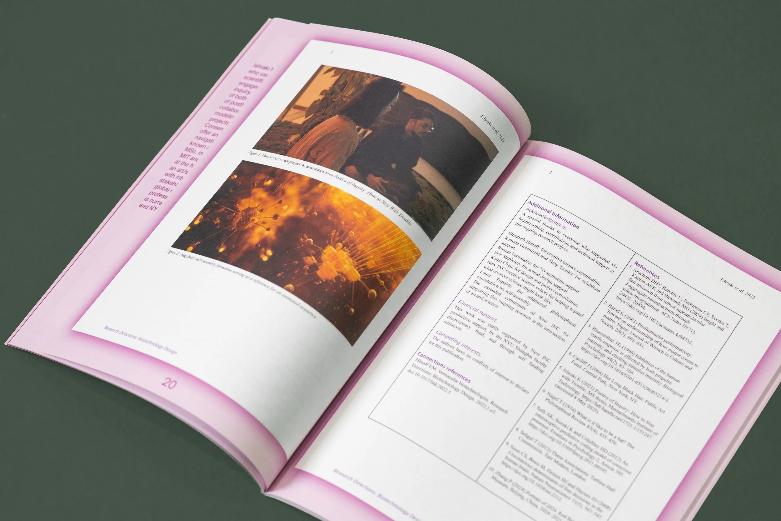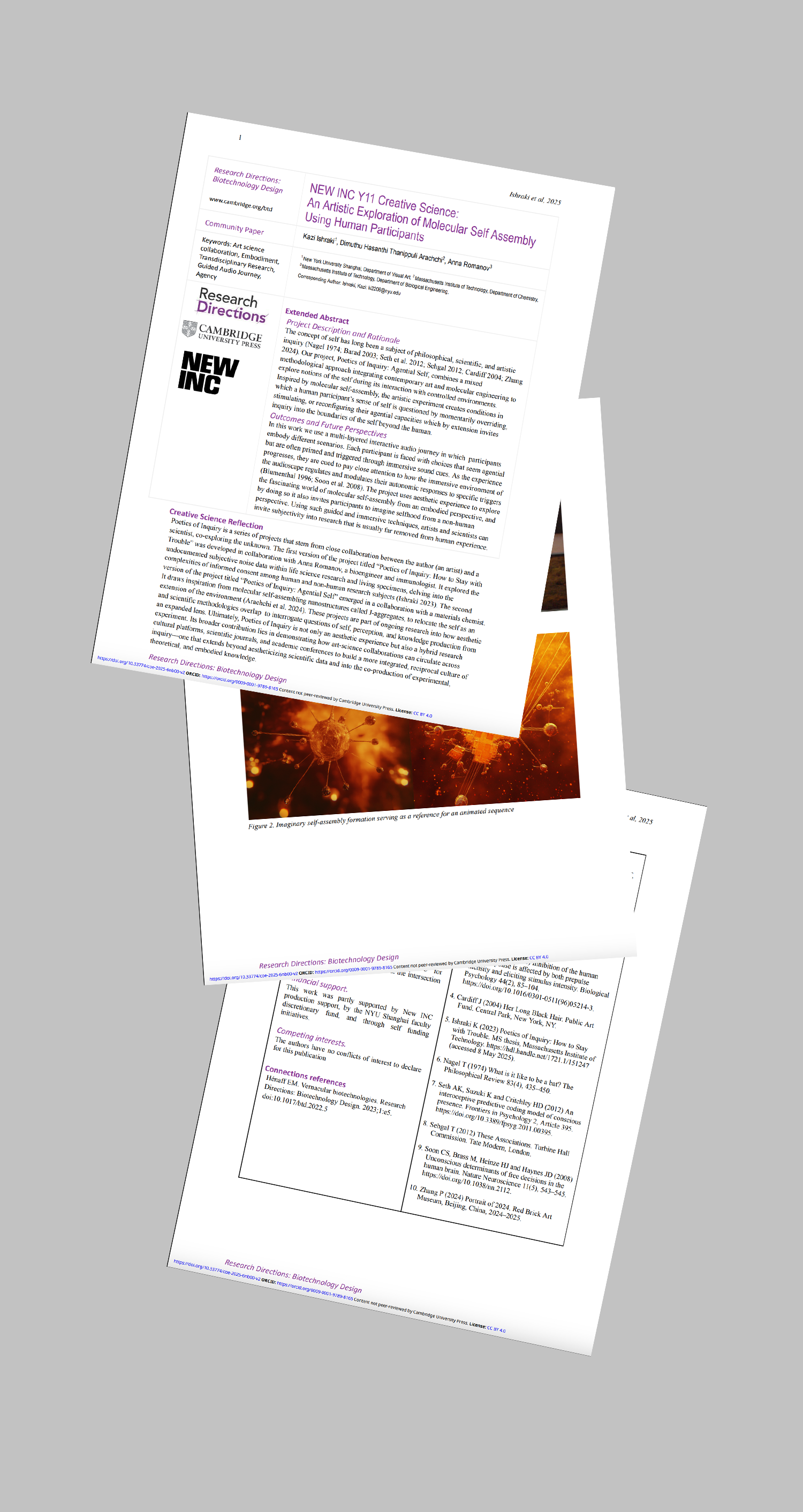 Poetics of Inquiry is a series of projects that stem from close collaboration between the author (an artist) and a scientist, co-exploring the unknown. The first version of the project titled “Poetics of Inquiry: How to Stay with Trouble” was developed in collaboration with Anna Romanov, a bioengineer and immunologist. It explored the undocumented subjective noise data within life science research and living specimens, delving into the complexities of informed consent among human and non-human research subjects (Ishraki 2023). The second version of the project titled “Poetics of Inquiry: Agential Self” emerged in a collaboration with a materials chemist. It draws inspiration from molecular self-assembling nanostructures called J-aggregates, to relocate the self as an extension of the environment (Arachchi et al. 2024). These projects are part of ongoing research into how aesthetic and scientific methodologies overlap to interrogate questions of self, perception, and knowledge production from an expanded lens. Ultimately, Poetics of Inquiry is not only an aesthetic experience but also a hybrid research experiment. Its broader contribution lies in demonstrating how art-science collaborations can circulate across cultural platforms, scientific journals, and academic conferences to build a more integrated, reciprocal culture of inquiry—one that extends beyond aestheticizing scientific data and into the co-production of experimental, theoretical, and embodied knowledge.